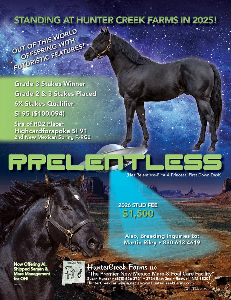 This stallion will bring exeptional genetics combined with outstanding conformation to your breeding program. RRelentless consistently produces progeny that break from the gate strong, run hard, and finish fast. He sires early maturing foals with excellent minds.